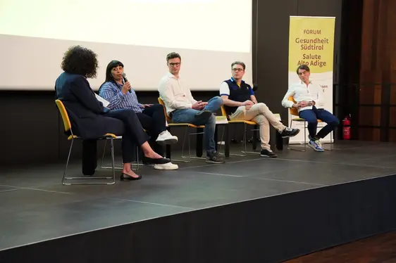 Auch eine Patientin saß auf dem Podium. Sie berichtete von ihrem durch Krampfadern verursachten Leidensweg und wie sie schließlich im Krankenhaus Brixen erfolgreich behandelt werden konnte.