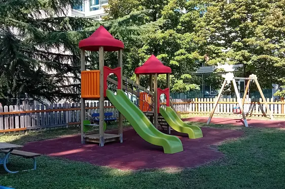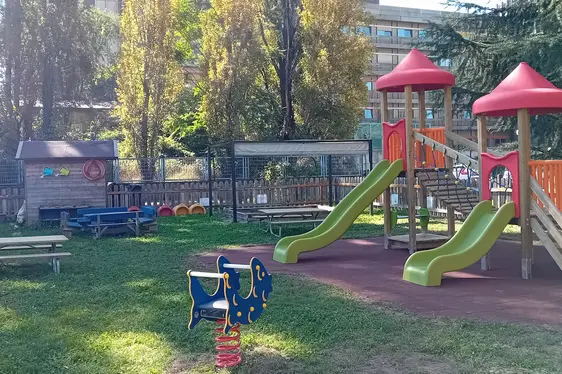 All’esterno i bambini possono usufruire di un giardino per i giochi all’aperto.