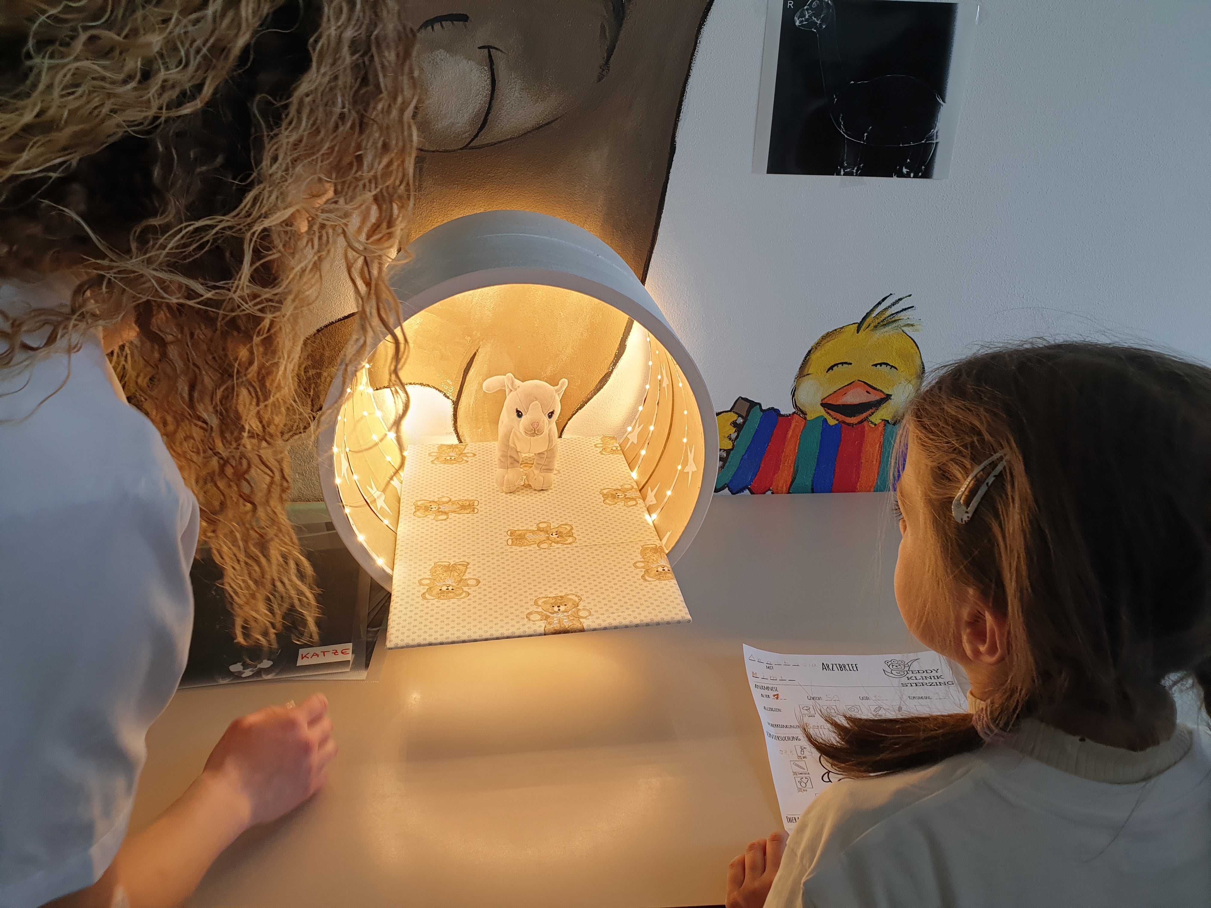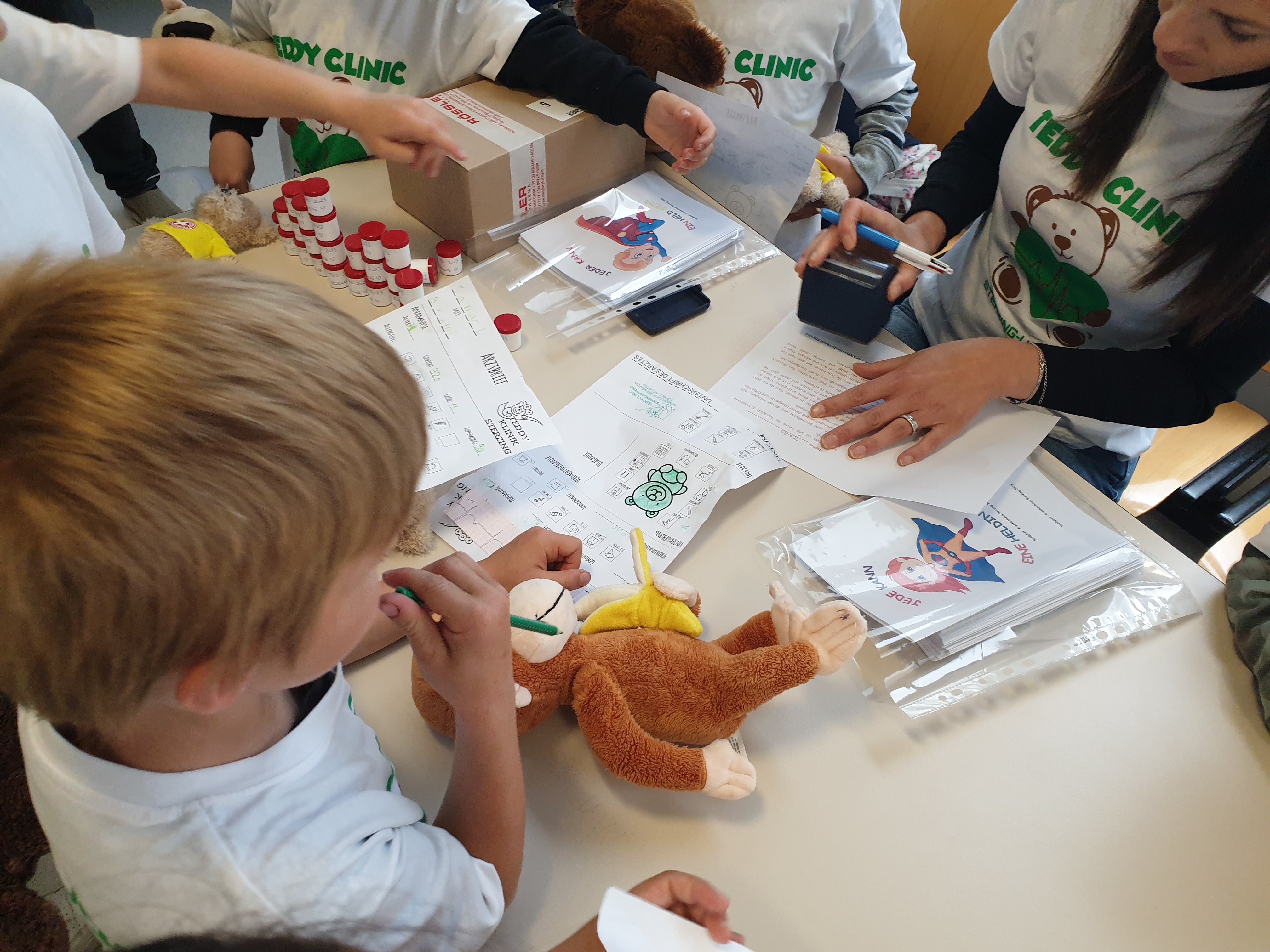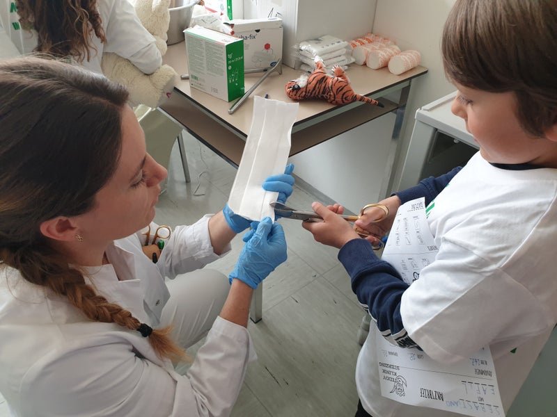 Il sangue e l’urina del peluche sono stati poi “esaminati” in laboratorio. Con il supporto della diagnostica per immagini – vale a dire dispositivi quali raggi-X, TAC ed ECG – sono state cercate le cause della malattia, in modo che i peluche potessero essere trattati correttamente, ingessati o addirittura operati. Le/i bambine/i hanno contribuito attivamente a tutti questi esami.